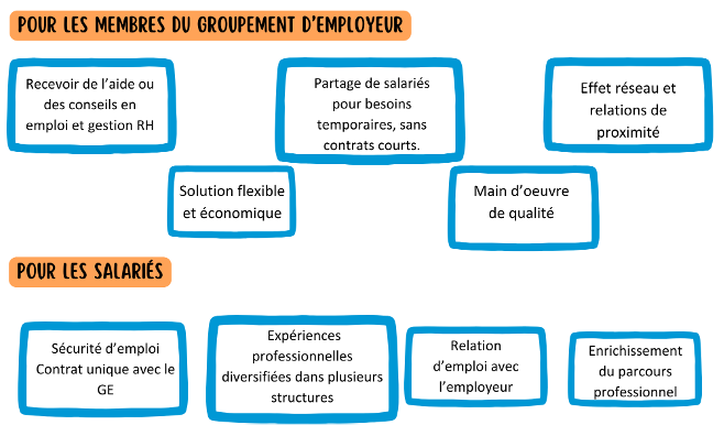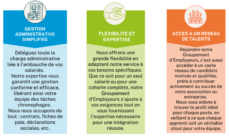 Toute personne physique ou morale peut rejoindre le Groupement d’Employeurs notamment compris les associations et collectivités publiques. L’objectif principal du Groupement d’Employeurs est de développer l’emploi et facilité l’embauche.